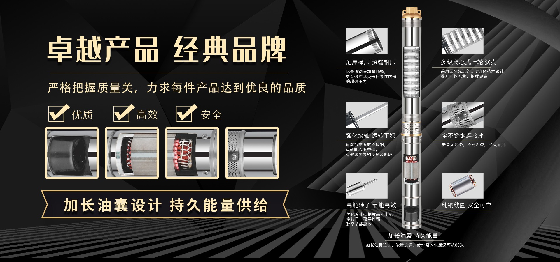 公司始终站在深井泵行业的前端位置,科研力量、产品和设备技术水平均达到国内优质水平,公司始终坚持走科技兴企、自主创新的企业发展之路,产品不断推陈出新,可广泛应用于农业灌溉、生活用水、循环供暖、污水处理、市政供水、石油化工、冶金矿山等领域。